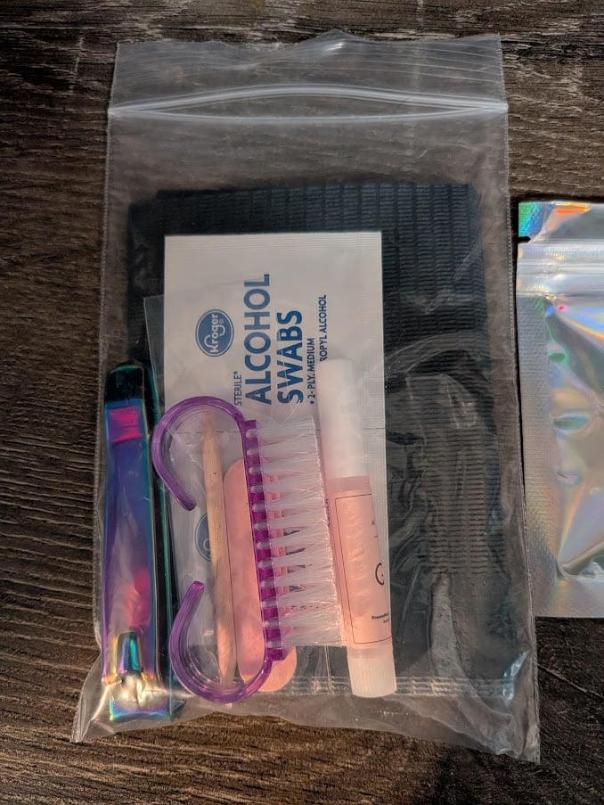 Includes: Disposable towel, alcohol wipes, mini orange stick and file. Also includes nail brush, full size nail clippers and nail glue.